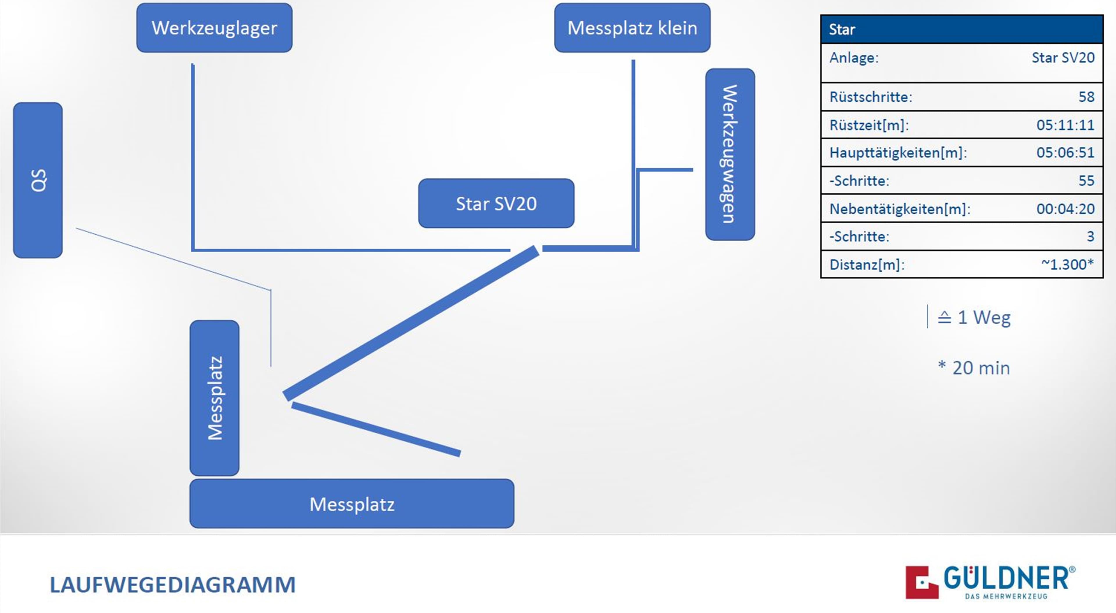 Was wir vorfanden, war auf den ersten Blick ein gut organisierter Rüstprozess: Werkzeuge, Werkzeughalter, Bauteile und Zeichnungen waren vorbildlich vorbereitet. Doch eine genauere Untersuchung deckte auf, dass der eigentliche Zeitverbraucher ganz woanders lag. Es waren die langen Laufwege, die notwendig waren, um die Bauteile zu messen – ein Aspekt, der dem Kunden bisher nicht in dieser Tragweite bewusst war. Unsere Analyse ergab, dass der Mitarbeiter für dieses Bauteil 1,3 km im Rüstprozess zurücklegte, nur um Messungen durchzuführen - eine überraschende Erkenntnis für den Kunden. Denn das Problem lag nicht im klassischen Rüstprozess, sondern in den Messvorgängen.
