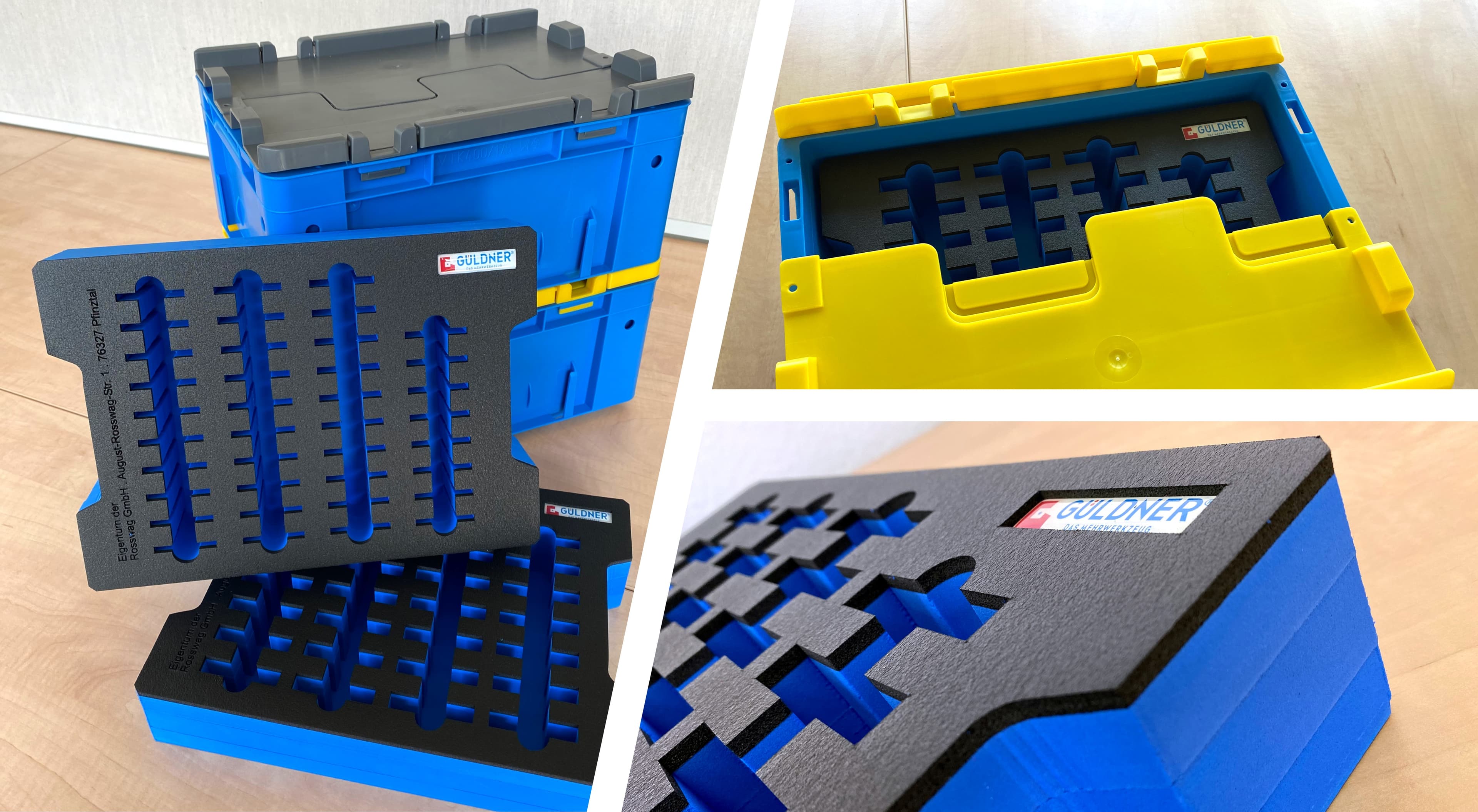 Unsere Lösung für das Problem: Kunststoffboxen mit einer passenden Hartschaumeinlage! Herr Huck aus unserer Projektabteilung hat für unseren Kunden je nach Größe der Bauteile Hartschaumeinlagen anfertigen lassen. Diese sind passgenau auf die Aufbewahrungsboxen abgestimmt.