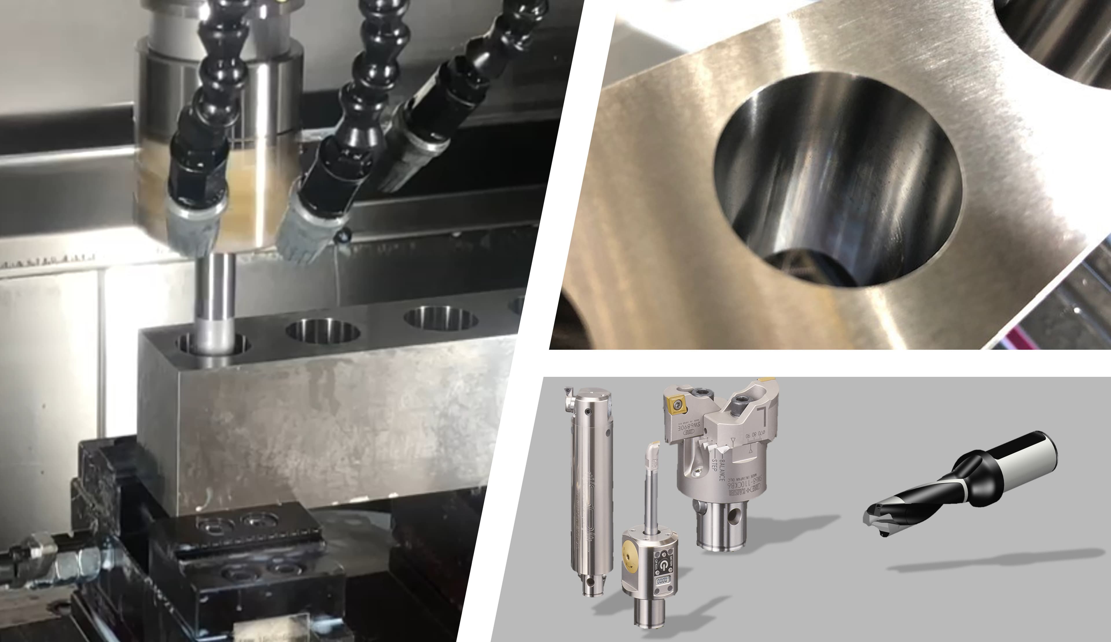 Jetzt wird das Rohteil ohne Bohrungen und damit günstiger bestellt. Die Kernlochbohrungen erfolgen mit einem Sandvik Wechselkopfbohrer, anschließend wird das Material gehärtet und ausgespindelt. Für die Auswahl und das Einfahren des Ausspindelwerkzeugs unterstützte uns ein Anwendungstechniker von BIG Daishowa. Das Ausspindeln dauert jetzt 8 Minuten in drei Durchgängen – Pro Bohrung werden 20 Sekunden benötigt.