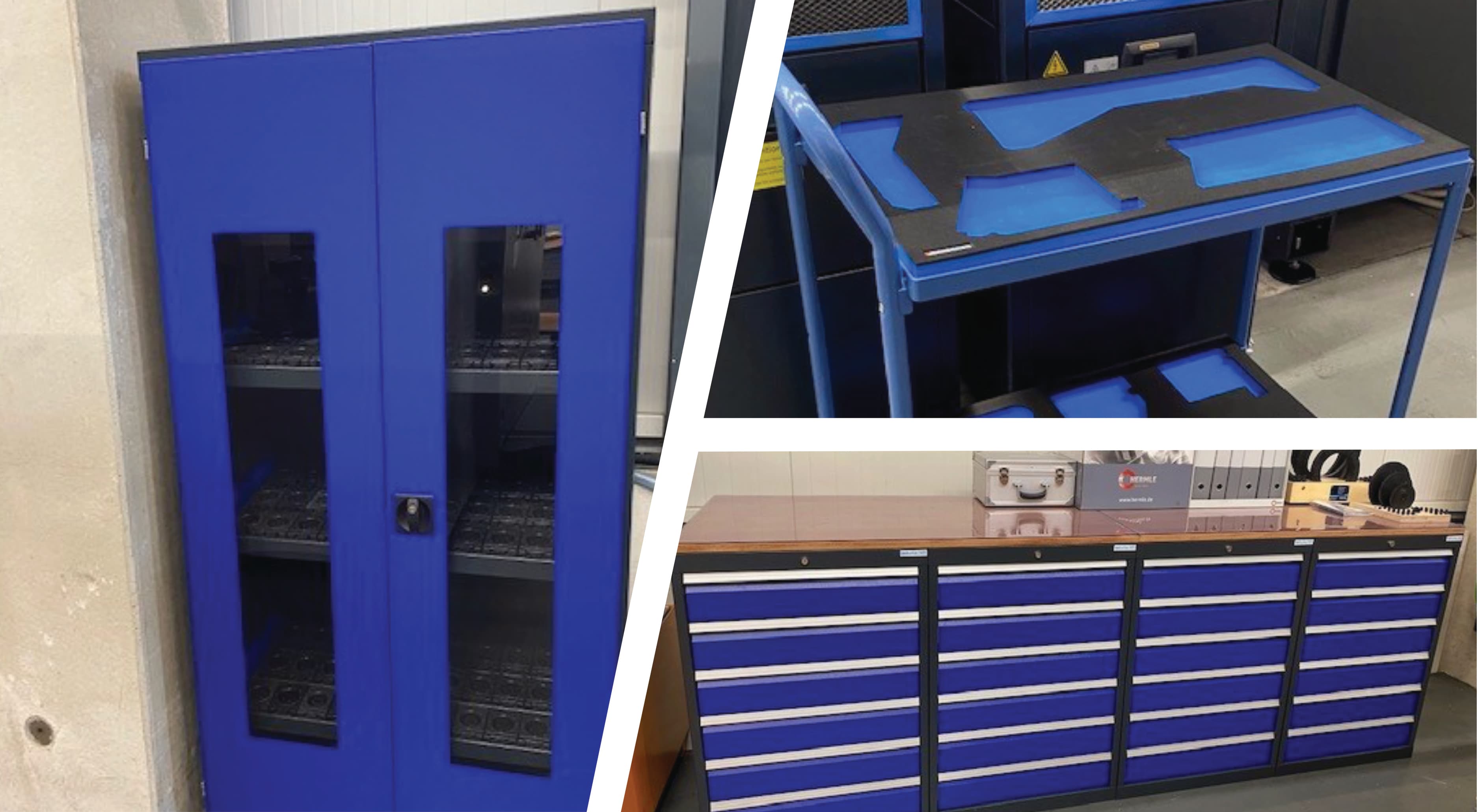 Für die neue Maschine haben wir zudem drei Schränke bereitgestellt, die die Lagerung der Werkzeuge und Bauteile perfekt unterstützen. Die Schränke sind speziell auf die Anforderungen des Kunden abgestimmt und tragen nicht nur zum Schutz der Werkzeuge bei, sondern erleichtern auch die Organisation im Arbeitsbereich. So wird sichergestellt, dass alles, was zur Maschinenbedienung benötigt wird, stets griffbereit und sicher verstaut ist.