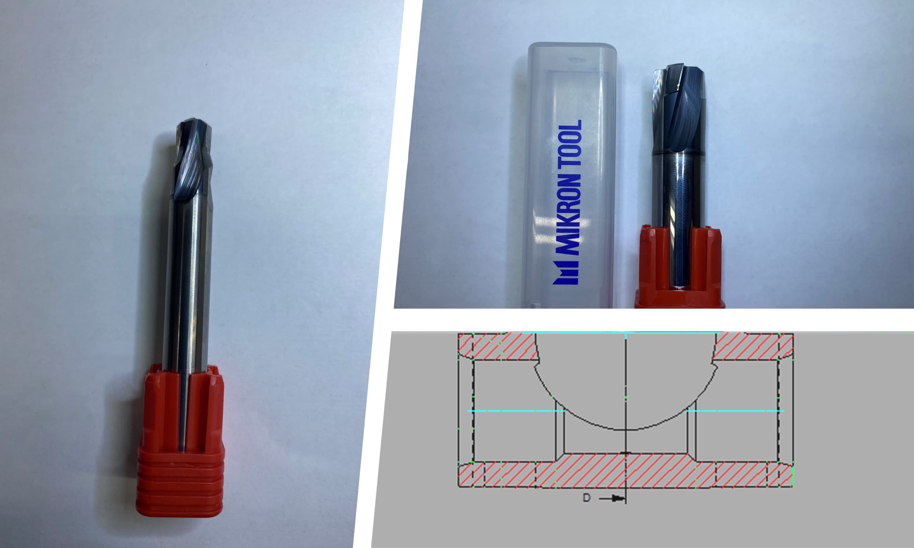 Für die Bearbeitung einer Innenkontur einer Bohrung sind bisher drei Arbeitsschritte mit zwei Fas- und einem Fräswerkzeug notwendig. Aufgrund der hohen Toleranz (+/- 0,01 mm) des dünnwandigen Rohteils führt dies zu Problemen beim Rundlauf, der Maßgenauigkeit und Gratbildung. Mit dem Einsatz der beiden Sonderwerkzeuge von MIKRON konnten diese Probleme behoben werden.