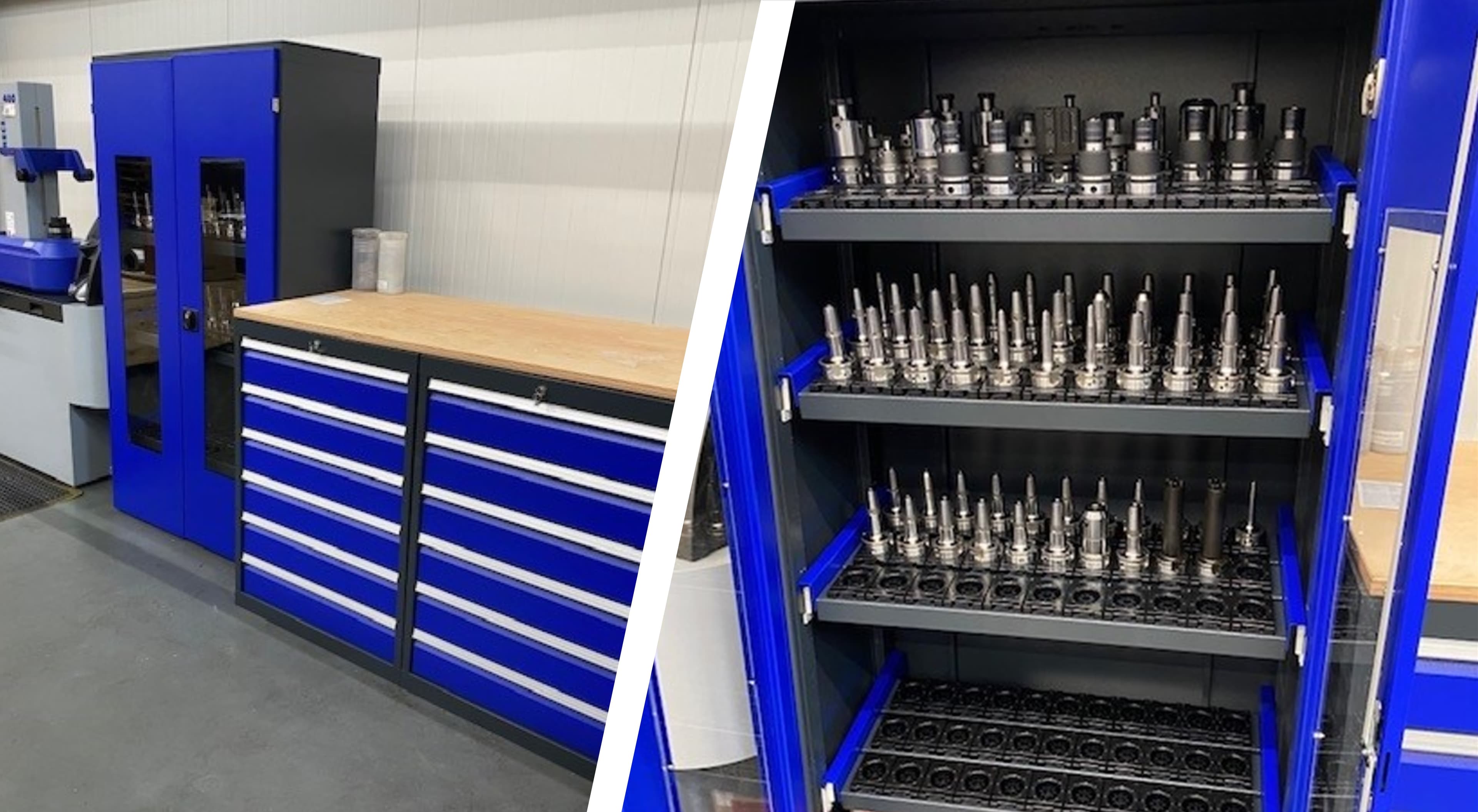 Aufgrund einer Maschinenanschaffung benötigte er eine Überarbeitung seines bisherigen Arbeitsplatzes. Er hatte alte Schubladenschränke, die nicht für hohe Gewichte ausgelegt waren. Unsere Zielsetzung war die optimale Lagerung der Werkzeuge.