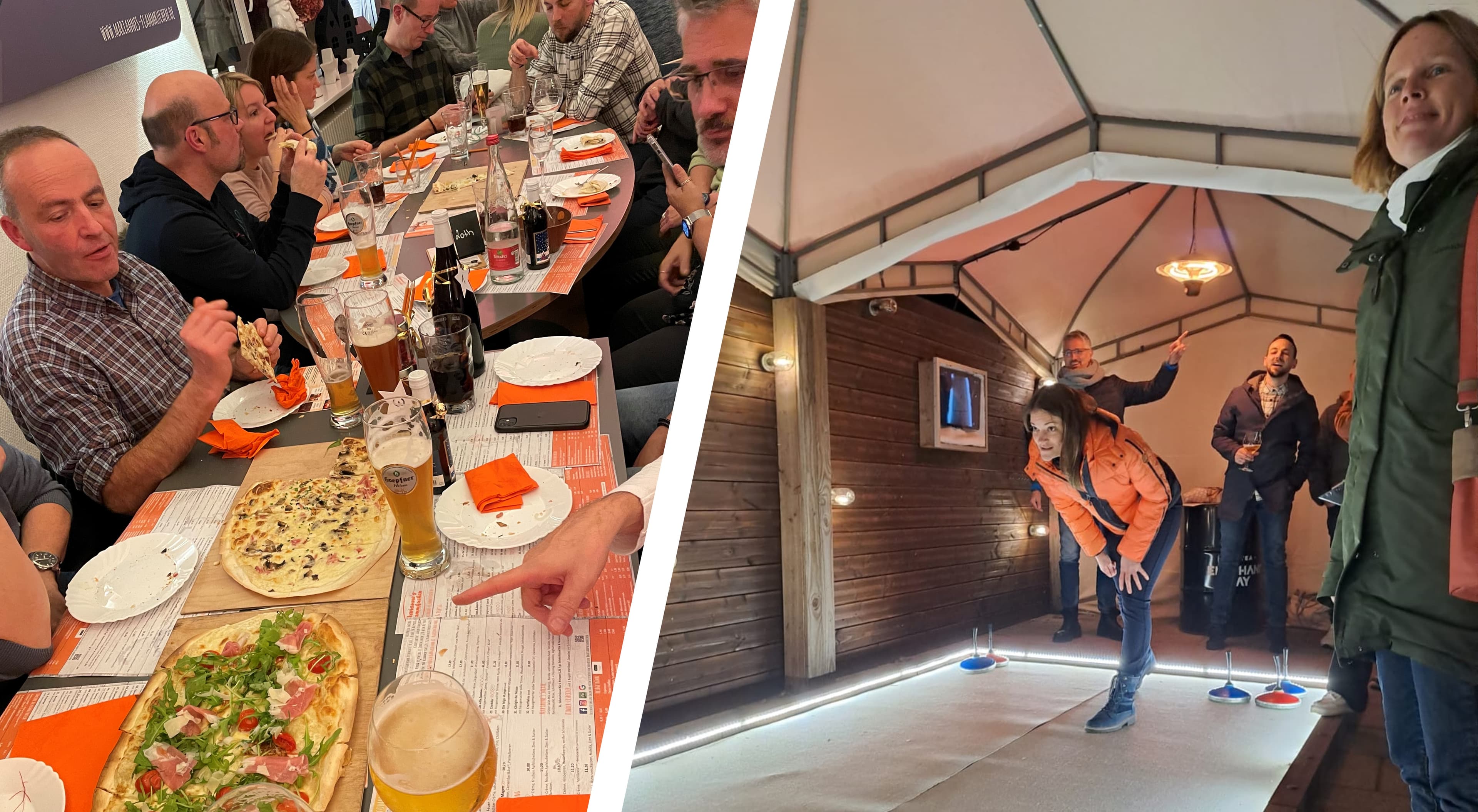 Zunächst fingen wir mit dem Eisstockschießen vor dem Lokal an, wo die Teams zwischen Lachen und sportlichem Ehrgeiz um den Sieg kämpften, während uns Glühwein und Kinderpunsch aufwärmten. Danach begaben wir uns ins Innere des Restaurants, um in gemütlicher Runde bei guten Gesprächen und lustigen Anekdoten den Abend fortzusetzen. Von klassischem Elsässer Flammkuchen bis hin zu kreativen Kreationen wurde jeder Geschmack getroffen.